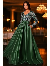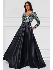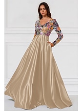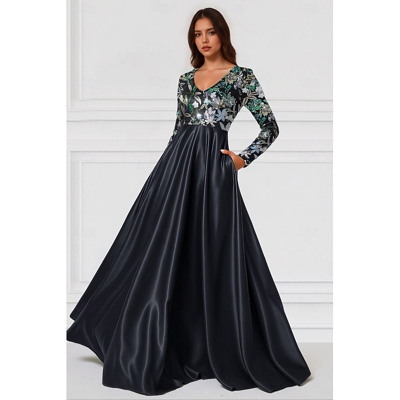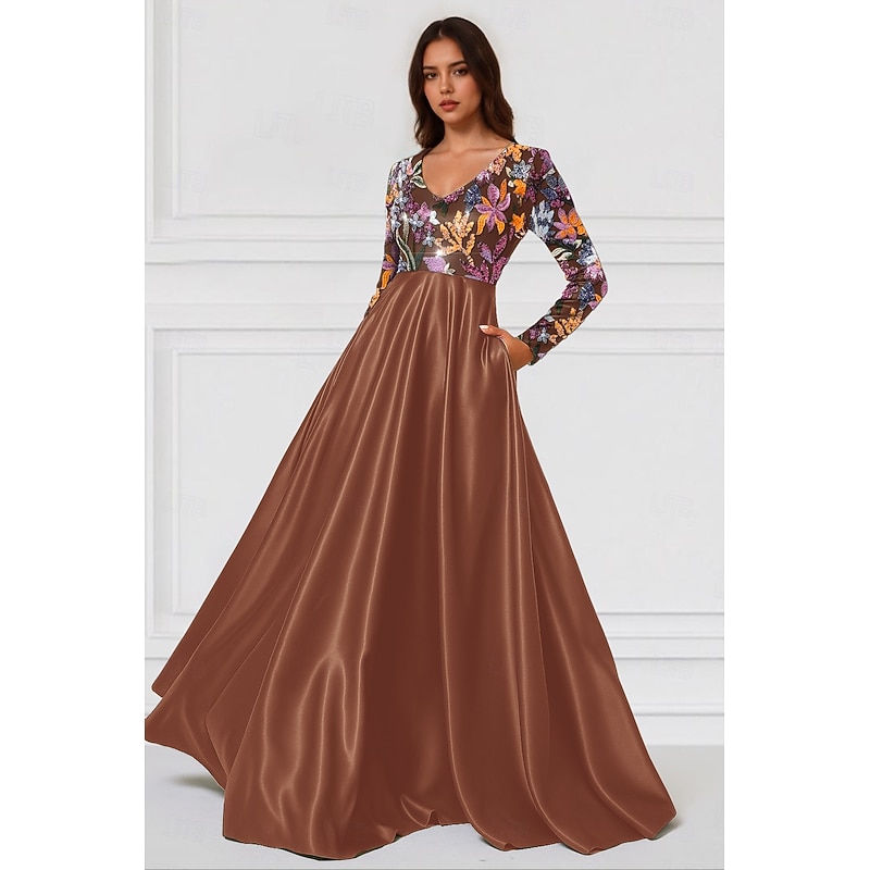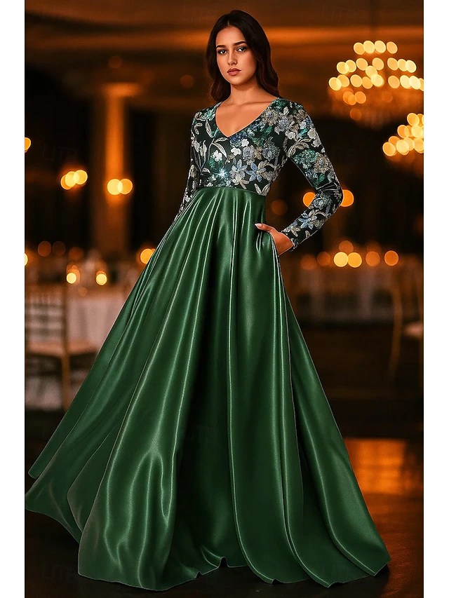 Floral Beased Lace Applique A-Line Evening Gown Elegant Dress Formal Wedding Floor Length Long Sleeve V Neck Stretch Satin with Pockets 2025