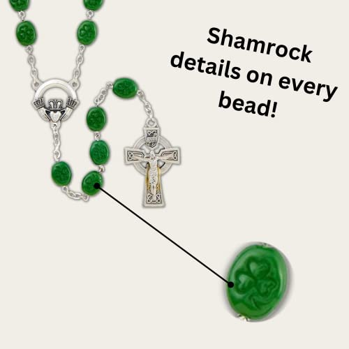 HOT ! Needzo Shamrock Rosary with Claddagh Centerpiece, Irish Catholic Unisex Prayer Beads, Religious Jewelry Necklace with Traditional Crucifix Charm Dangle