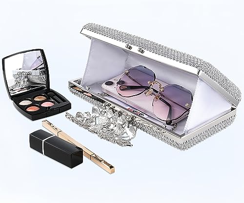 Fabric type: 85% rhinestone / 15% metalOrigin: ImportedClosure type: ClaspLining: SatinSize: 8.6 x 2 x 4.5 inches (11.4x21.8x5 CM ); weighs a mere 1.2 pounds (0.55 KG)Provides ample space for your cell phone and other essentialsDetachable chain strap for easy-to-use conversion into a crossbody bag; ideal for weddings and the bride's special dayElegantly adorned with dazzling crystals and silver metal; adds a touch of bling to any dressy occasionShimmering rhinestones make it an exquisite addition to your prom ensemble; this evening bag is a statement piece that ensures you'll stand out from the crowd