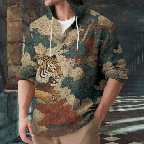 Men's Japanese Long Sleeve Hoodie, Japanese Art Funny Cat Chinese Panda Quarter Button Hoodie Casual Cool Top For Spring Fall