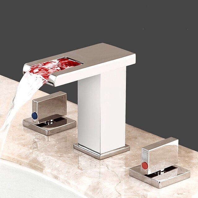 HOT ! Waterfall Bathroom Sink Mixer Faucet LED Light Deck Mounted Brass, Widespread 2 Handle 3 Hole Washroom Basin Vessel Taps with Hot and Cold Water Hose