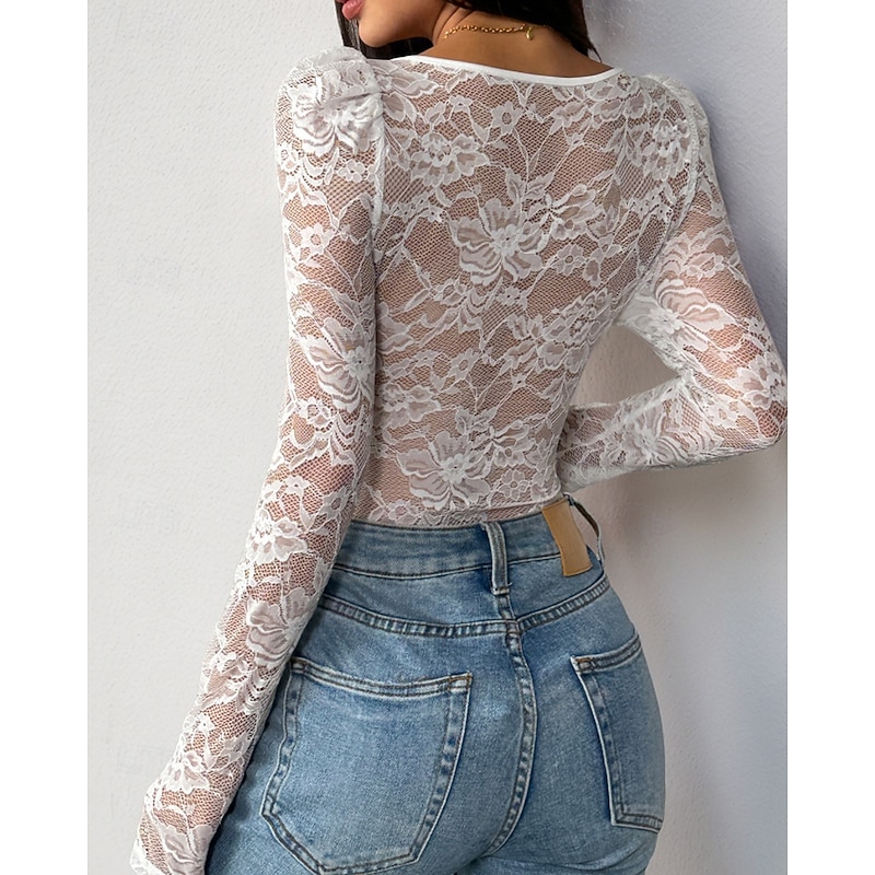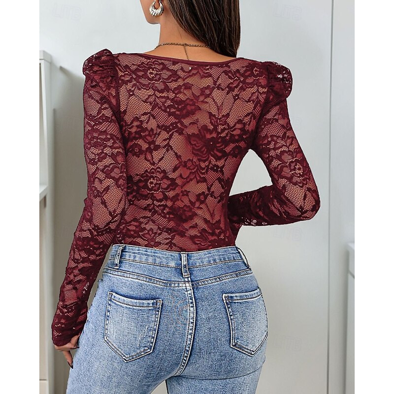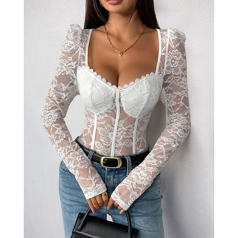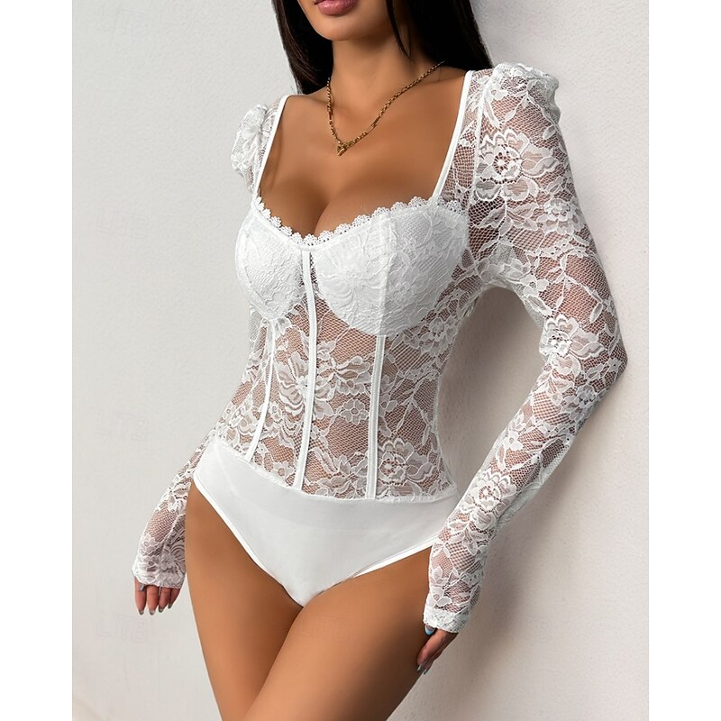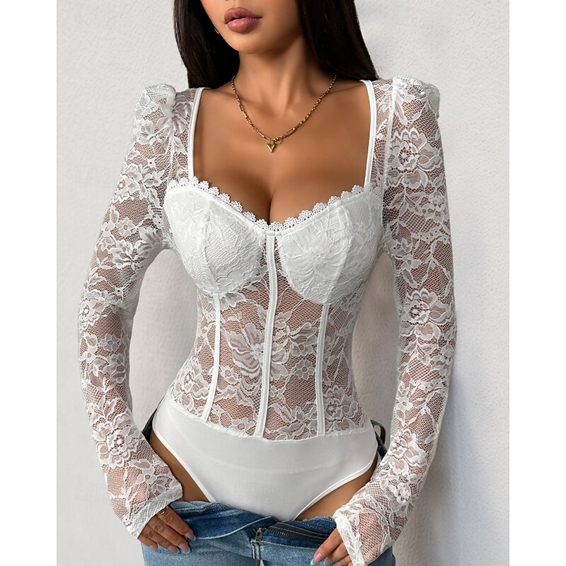 More information about Women's Normal Bodysuit Streetwear Solid Color Long Sleeve Square Neck Lace Vacation Holiday Regular Fit Black White Wine Fall