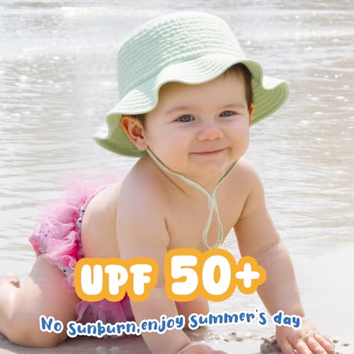 • SAFETY RELEASE CHIN STRAP: The newborn sun protection beach hat comes with a durable chin strap to keep it stay on baby head when they are playing or in wind and the strap is easy to slide up and down. Perfect for baby girls and boys to have a great play time outside. Definitely a great accessory for your little girls and boys in daily life and easy to folds up and carry