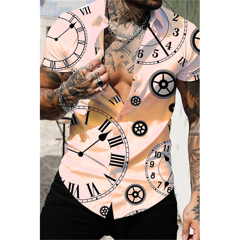 Men's Clock Shirt Button Up Shirt Short Sleeve Vintage Sports Fashion Casual Daily Holiday Summer Spring Turndown Print Button-Down Light Yellow White Purple Orange Green 11