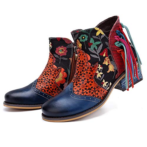 More information about CrazycatZ Women's Leather Ankle Booties, Bohemian Pattern Short Boots Flower Splicing Pattern Handmade Vintage Shoes Exotic Booties