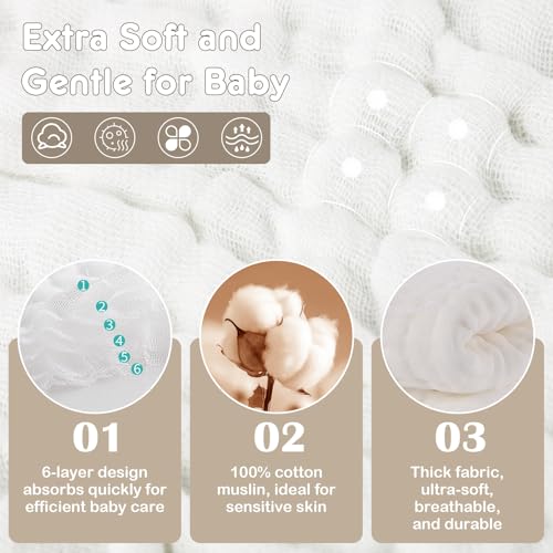 • Highly Absorbent, 6-Layer Thick Design These muslin burp cloths feature a 6-layer design that provides excellent absorbency to handle spit-ups and drools with ease. Large 20x10 inches size offers maximum coverage and is suitable for all seasons.