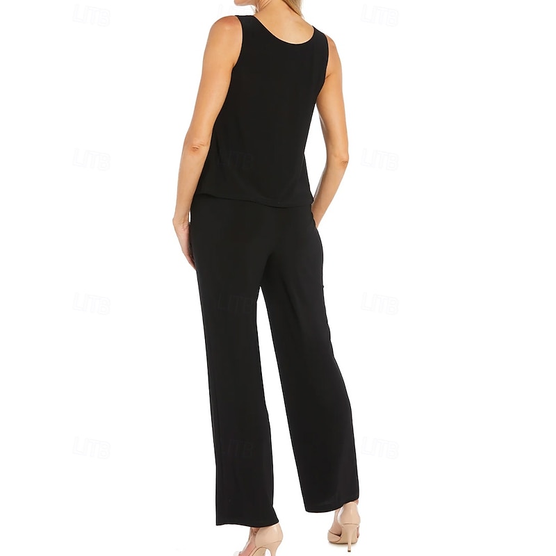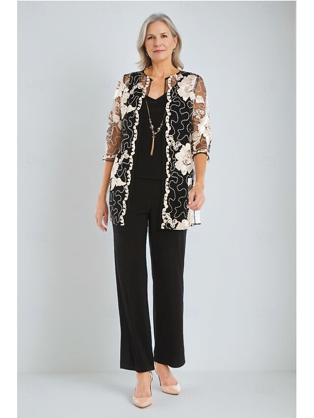More information about Pantsuit 3 Piece Pantsuit Mother of the Bride Pantsuit Elegant Vintage elementary V Neck Ankle Length Stretch Chiffon Half Sleeve with Sequin Ribbon Embroidered Appliques