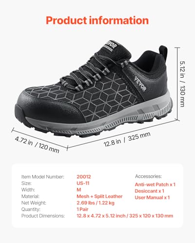 VEVOR Men's Aluminum Steel snug Lightweight Cushion Alloy Construction Safety Toe Industrial Work Shoes