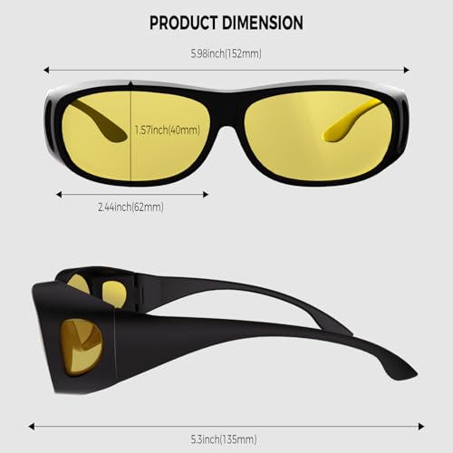 Origin: ImportedHD Night Vision Lenses: Engineered with polarized yellow-tinted lenses and a specialized anti-reflective coating, these glasses significantly reduce glare from oncoming headlights and streetlights, enhancing clarity and reducing eye strain during nighttime driving. This ensures a safer and more snug driving experience in low-light conditions.Designed to Fit Over Prescription Glasses: These night vision glasses are expertly crafted to accommodate those who wear prescription eyewear. They can easily be worn over existing nearsighted or reading glasses, providing an optimal solution for individuals with corrective lenses, contact lens wearers, or those with normal vision.Ergonomic Wrap-Around Design: Featuring a highly functional wrap-around structure, these glasses provide superior coverage, offering excellent protection for the eyes and face. The large front lenses ensure broad coverage, while the integrated side lenses enhance peripheral vision and reduce glare from all angles.Premium Materials: Constructed from robust and unbreakable TR90 frame material, coupled with high-quality, 1.1mm thick shatterproof TAC lenses, these glasses boast superior durability. The sturdy internal metal hinges, contoured nose pads for comfort, and non-slip rubberized temple tips all contribute to an exceptional, long-lasting user experience.Versatile Applications: These anti-glare glasses enhance visual clarity in a variety of low-light scenarios, such as foggy, overcast, rainy, and nighttime conditions. Ideal for night driving, motorcycling, cycling, running, walking, fishing, and other outdoor activities, they improve overall performance and safety, making them a valuable asset for any outdoor enthusiast. Perfect for everyday use. superior materials and excellent craftsmanship ensure long-lasting durability.