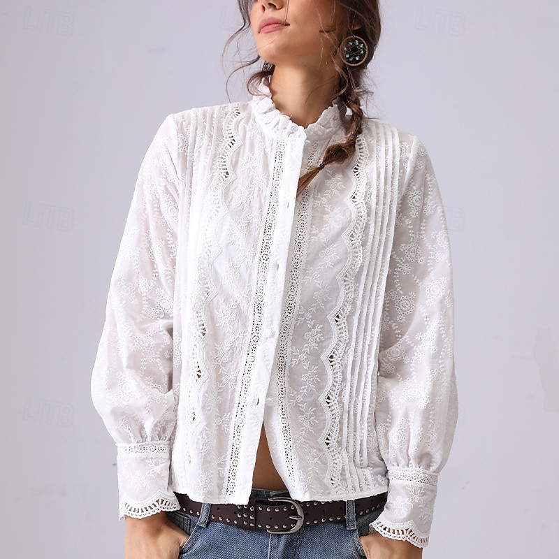 More information about Women's Linen Tencel Shirt Solid Color Elegant Bohemia Vintage Long Sleeve High Neck Regular Tops Work Daily Holiday Ruffle Embroidered White Apricot Summer Spring Fall