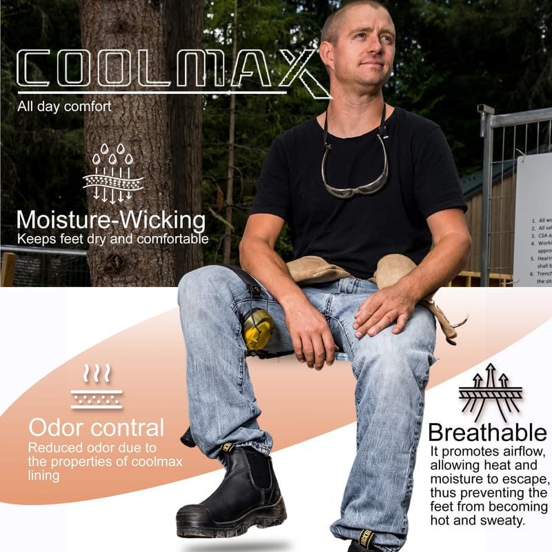 • Coolmax Moisture-Wicking Lining for All-Day Comfort: Our boots are equipped with a cutting-edge Coolmax lining that actively wicks away moisture, keeping your feet cool, dry, and comfortable all day long. Whether you're working hard or enjoying outdoor adventures, this innovative feature ensures optimal breathability and prevents unpleasant odors. Experience the ultimate in comfort with our Coolmax-lined boots.