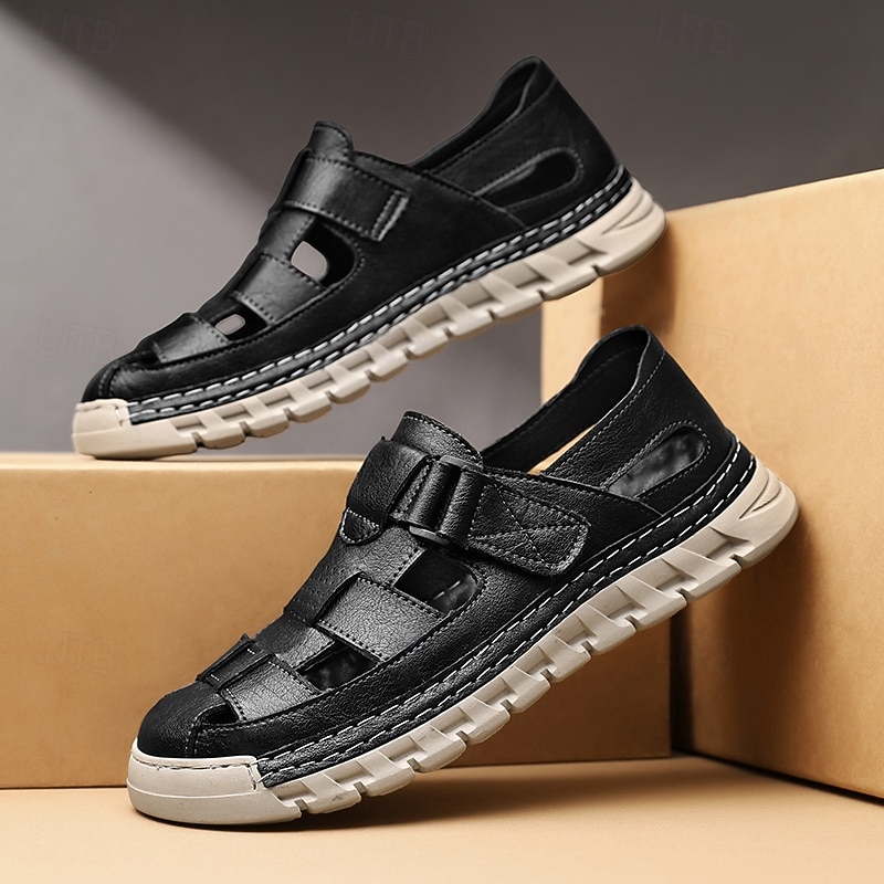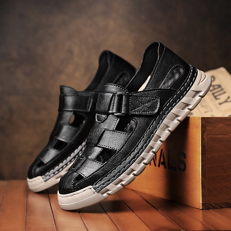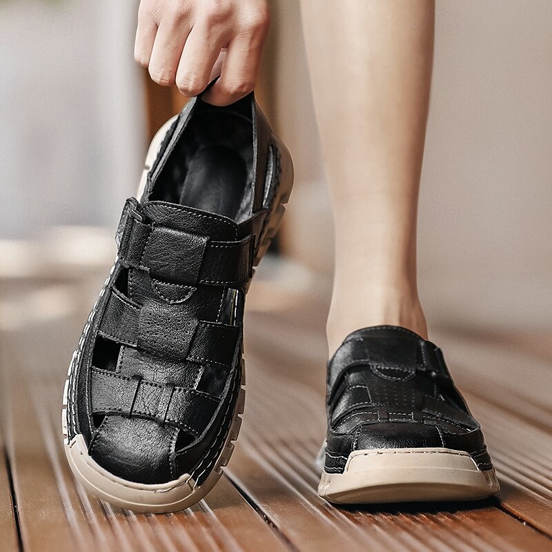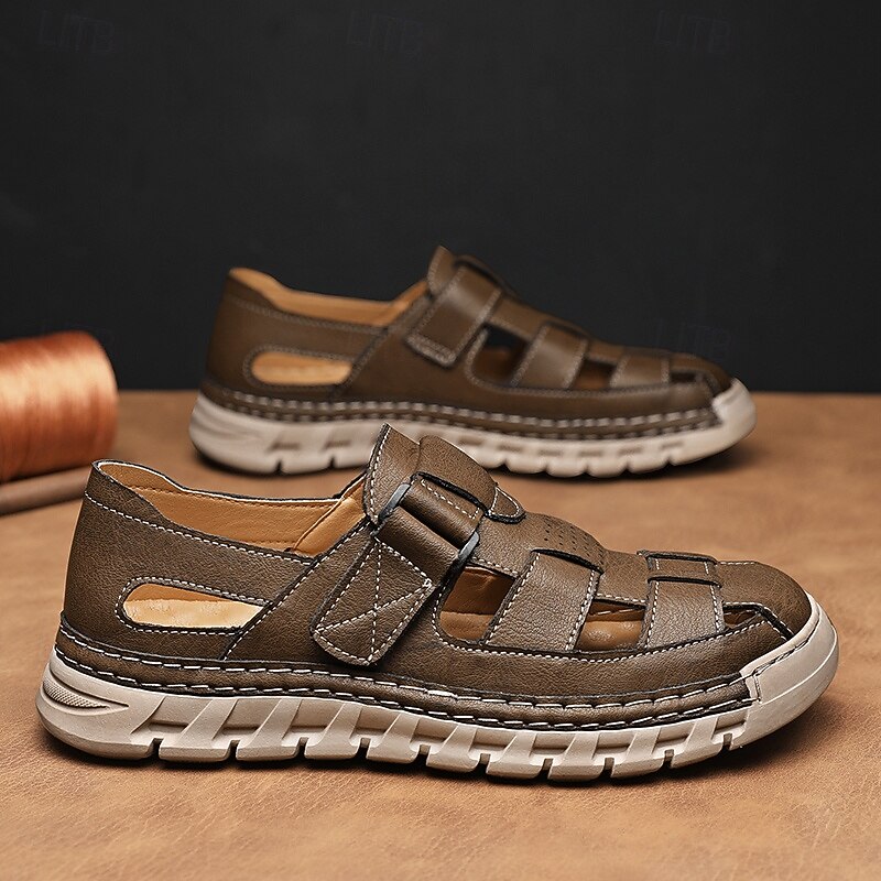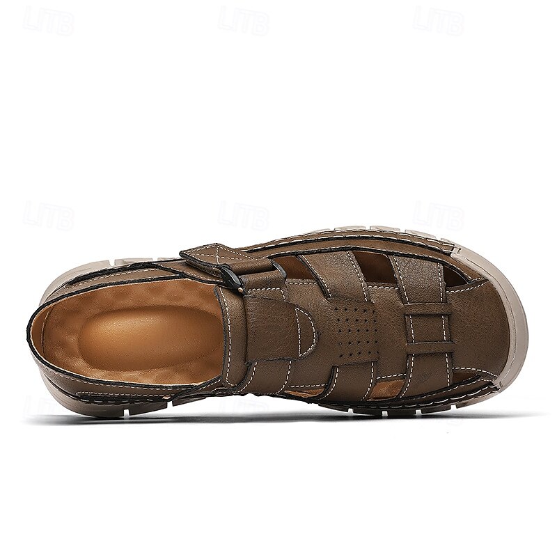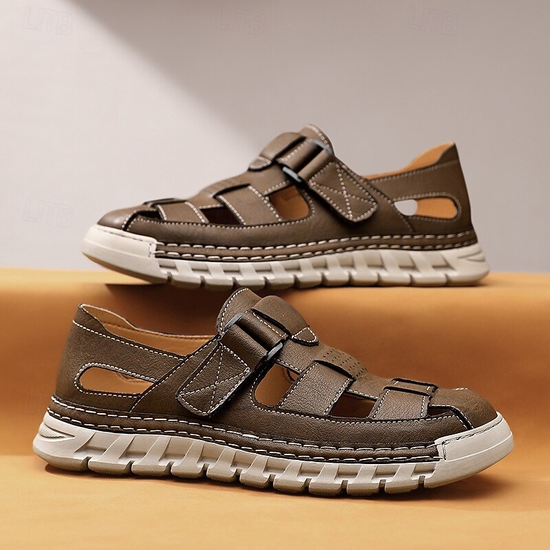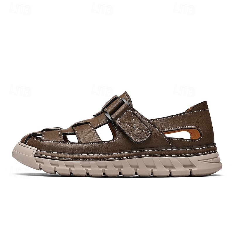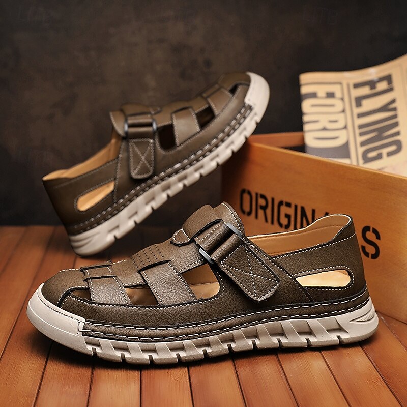 HOT ! Men's Brown Faux Leather Fisherman Sandals – Comfortable Velcro Strapped Outdoor Shoes for Summer and Casual Wear
