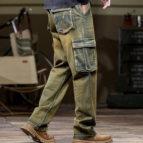 • Feature: Button and zipper fly, straight leg, relaxed fit, vintage yellow and blue washed design, casual mens denim cargo pants for daily wear