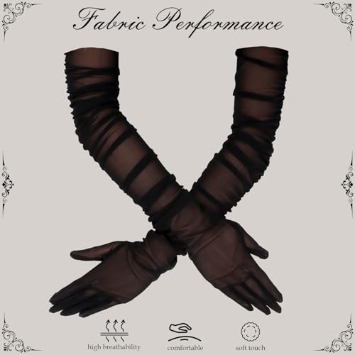 • Super Long Gloves For Women: Length 28.7 inches. They are true elbow lenth opera gloves that definitely long enough to cover your whole arm. Very stretch and flexible, the black sheer gloves are perfect for everyone’s fit.