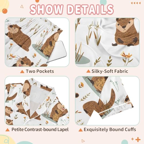 ALAZA Cute Beavers Leaf Blossom Satin Pajamas Set Short Sleeve Button Down Sleepwear Summer Pjs 2 Piece 6