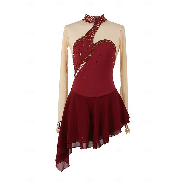 More information about Figure Skating Dress Women's Girls' Ice Skating Dress Burgundy Patchwork Open Back Mesh Spandex Stretchy Training Practice Professional Skating Wear Thermal Warm Crystal / Rhinestone Long Sleeve Ice