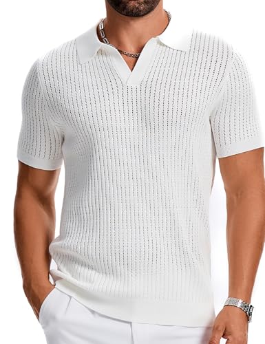 Mens Polo Shirts Ribbed Hollow Knit Polo Shirt Short Sleeve Muscle V Neck Golf Tees 1