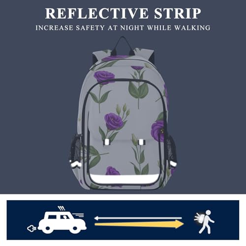 Purple Flowers Green Leaves White Backpack for School Boys Girls, Front Flap School Bag, 17 Inch Kids Laptop Backpack, Age 6-12