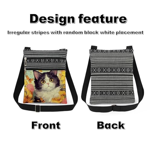 • ​​3. 【Design】​​The Cat crossbody bag uses heat transfer printing technology for fade-resistant patterns. The irregular black-and-white stripes are crafted with a woven process, and their placement varies randomly (positions may differ slightly due to hand-cutting). The dual-pocket design helps efficiently organize different items, while the adjustable strap accommodates most users.
