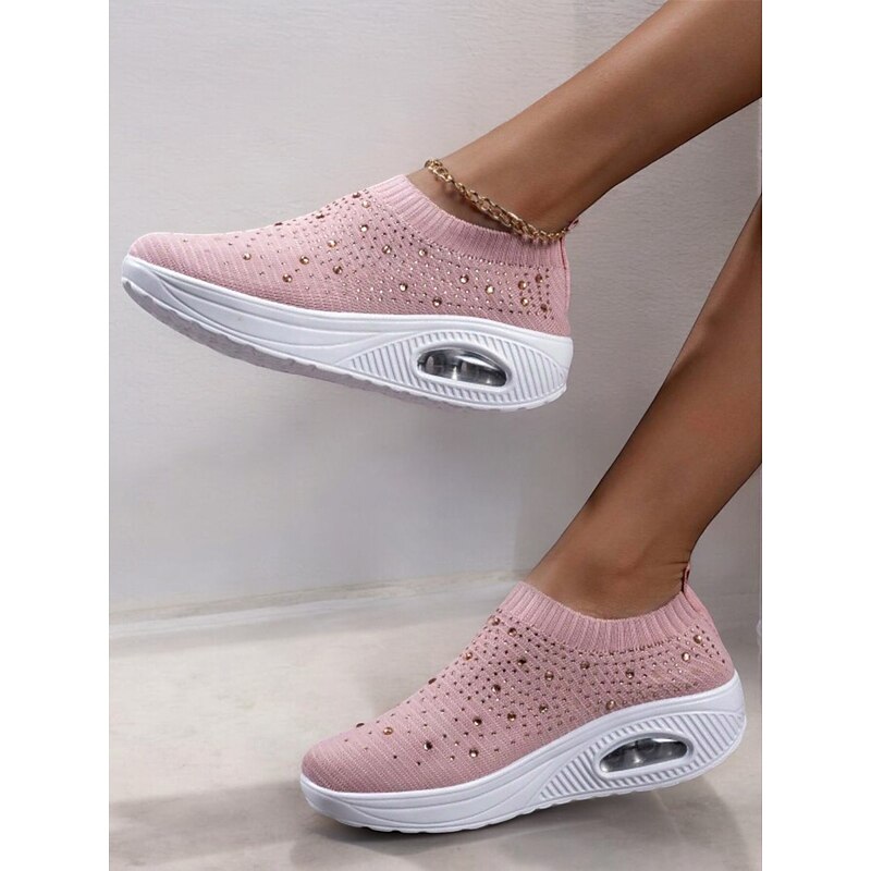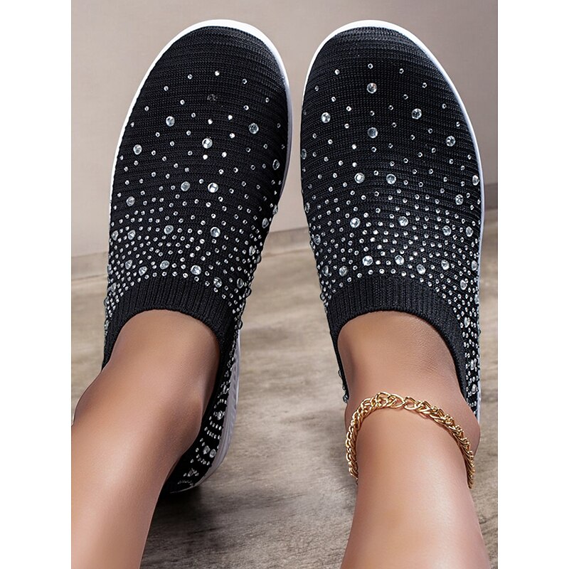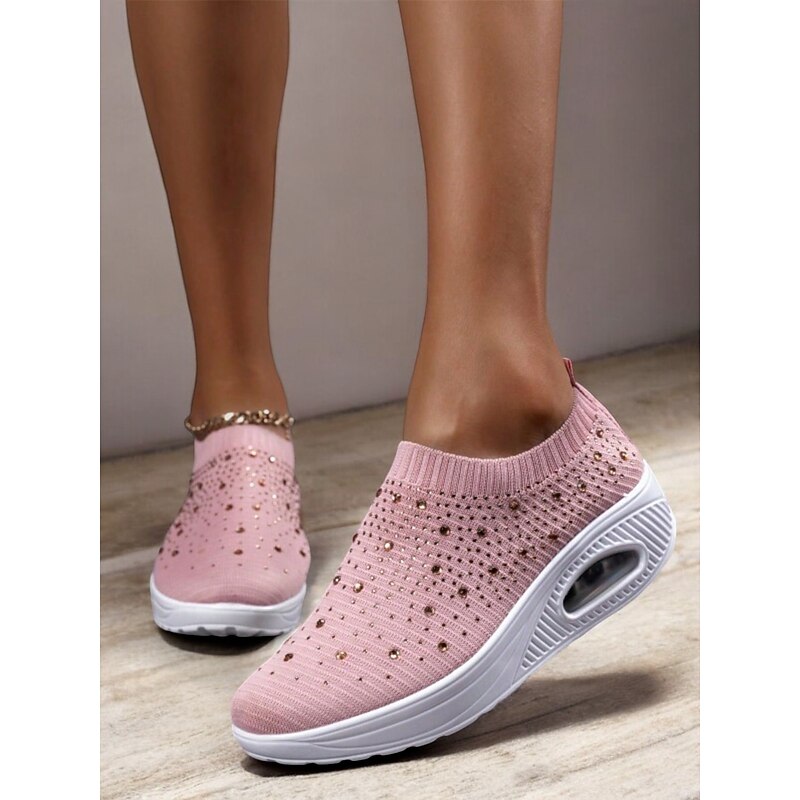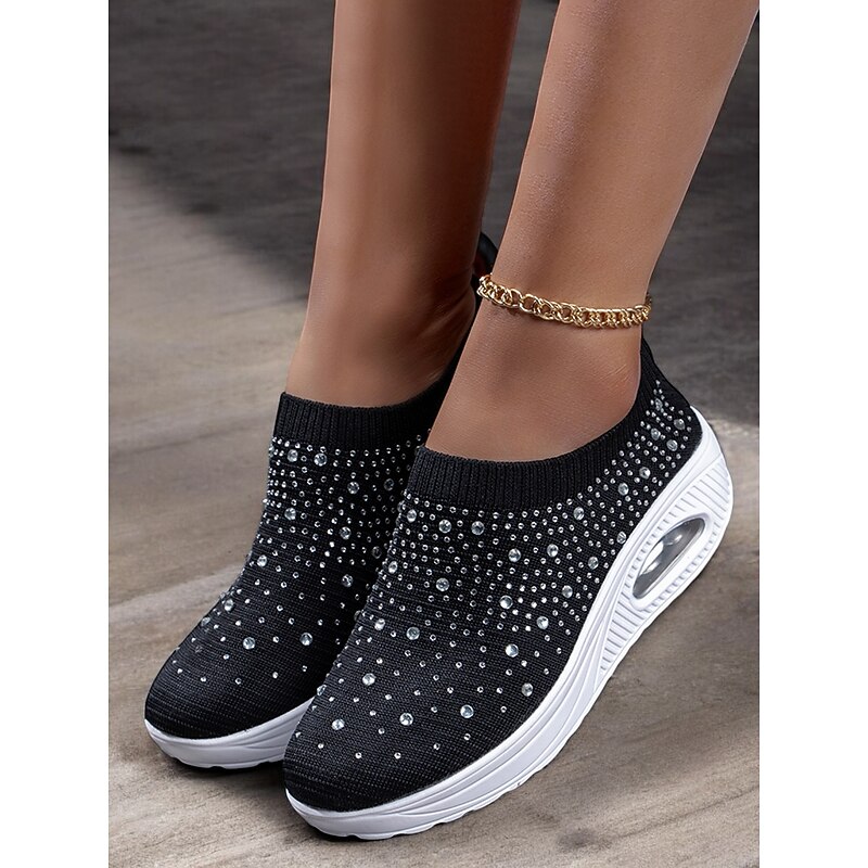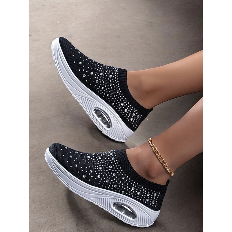 Highlights [Fabric] Crafted with a breathable and flexible Flyknit upper, these slip-on sneakers offer a comfortable and lightweight fit, perfect for all-day wear. [Silhouette] The sleek slip-on design ensures ease of wear while providing a snug yet comfortable fit that adapts to your foot's natural shape. [Design Highlights] Adorned with colorful rhinestones, these sneakers bring a touch of glamour to any casual or sporty outfit. The thick platform sole provides excellent support and cushioning, ideal for extended walking sessions. [Occasions] Perfect for daily wear, travel, and casual outings, these sneakers are designed for those who want to combine style with practicality, making them a versatile choice for various activities. [Size Range] Available in sizes ranging from US6 to US9.5-10, these sneakers cater to a wide variety of foot sizes, ensuring a perfect fit for many women.