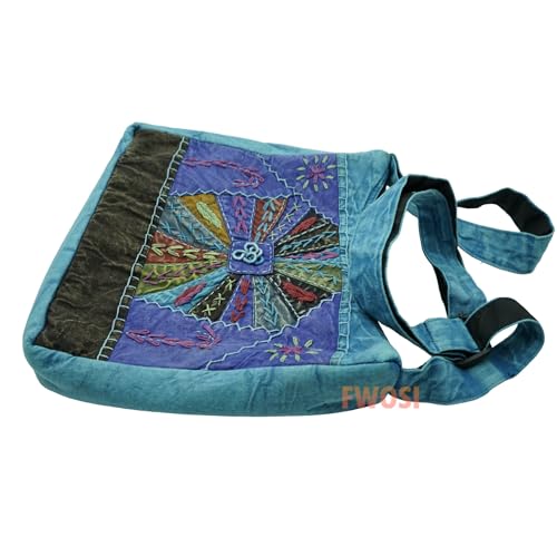 • HANDCRAFTED DESIGN: Beautiful cotton messenger bag featuring intricate embroidered sunburst pattern in purple and teal with detailed stitching and artistic embellishments