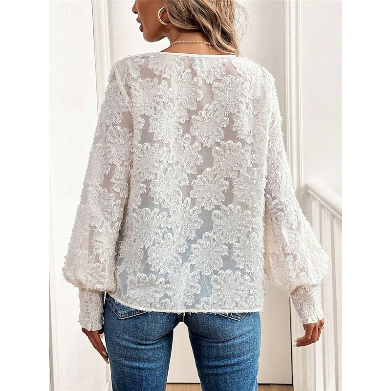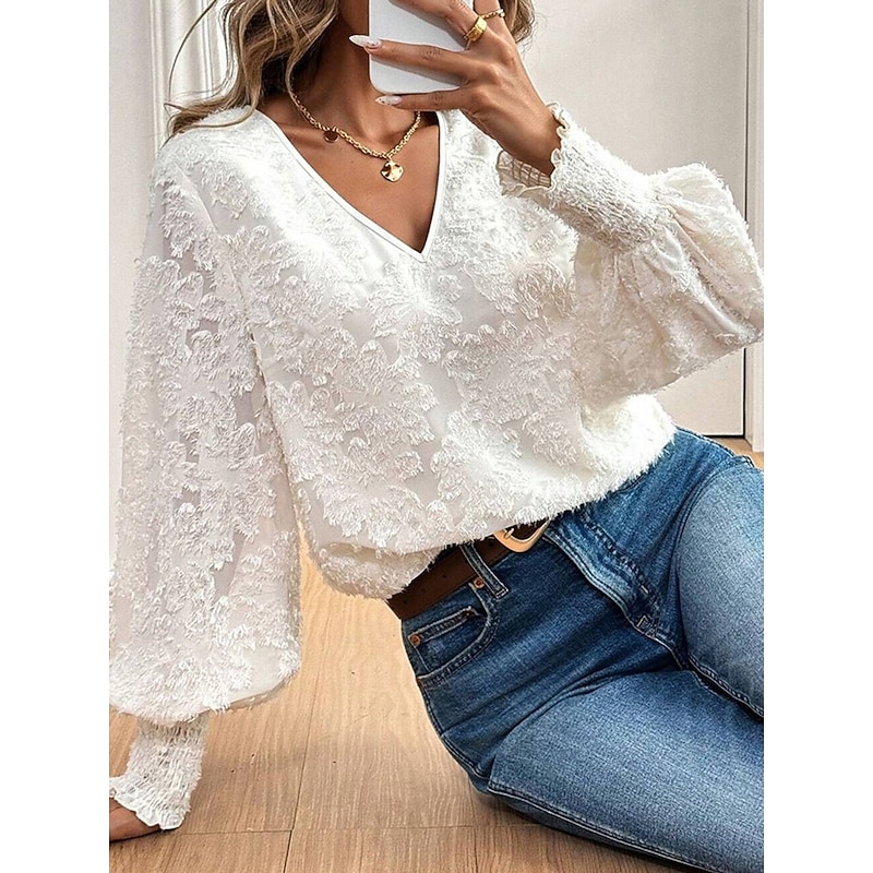 More information about Women's Shirt Blouse Solid Color Basic Casual Long Sleeve Lantern Sleeve V Neck Regular Tops Daily Lace Embroidered White Fall Winter