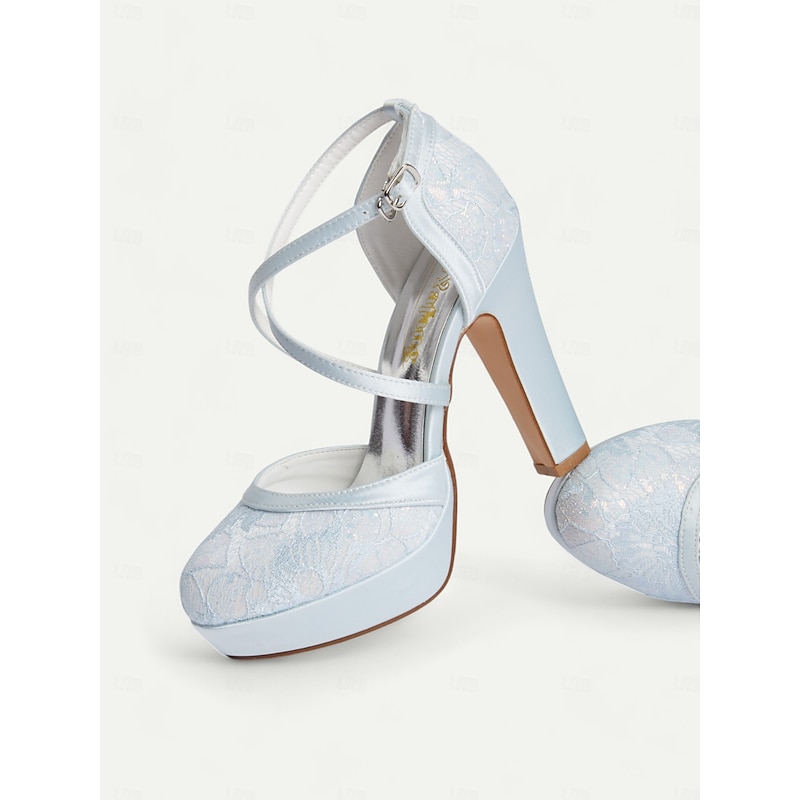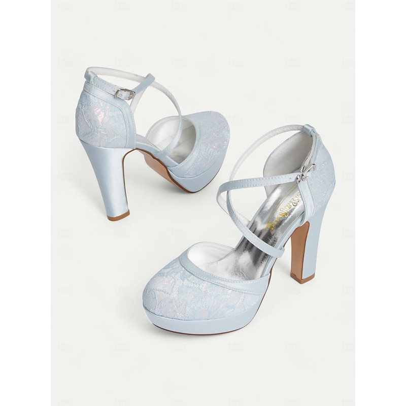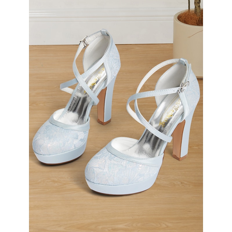 Women's Blue Satin Platform Heels with Crisscross Straps - Elegant Vintage-Style Pumps for Weddings and Graduation