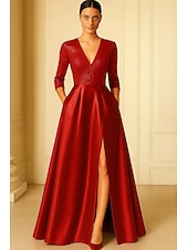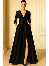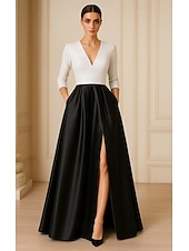 More information about Black and White Sequined A-Line Evening Gown Elegant Formal Dress Formal Wedding Floor Length 3/4 Length Sleeve V Neck Pocket Satin with Pleats Slit 2025