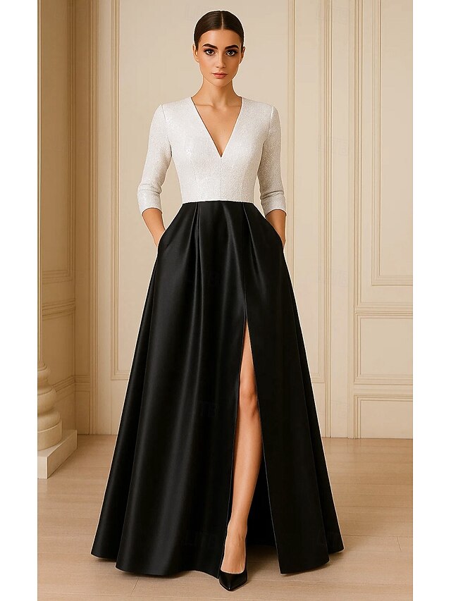 $134.99 - Black and White Sequined A-Line Evening Gown Elegant Formal Dress Formal Wedding Floor Length 3/4 Length Sleeve V Neck Pocket Satin with Pleats Slit 2025 2025. Shop for cheap A-Line Evening Dresses online? Buy at lightinthebox.com on sale today!