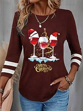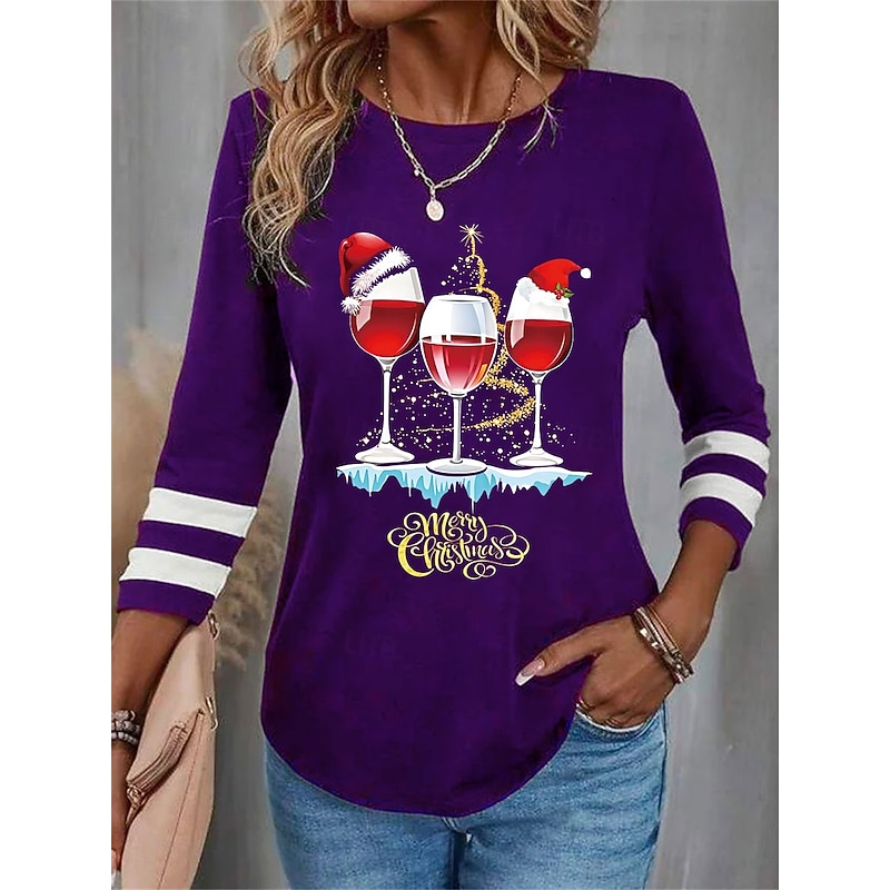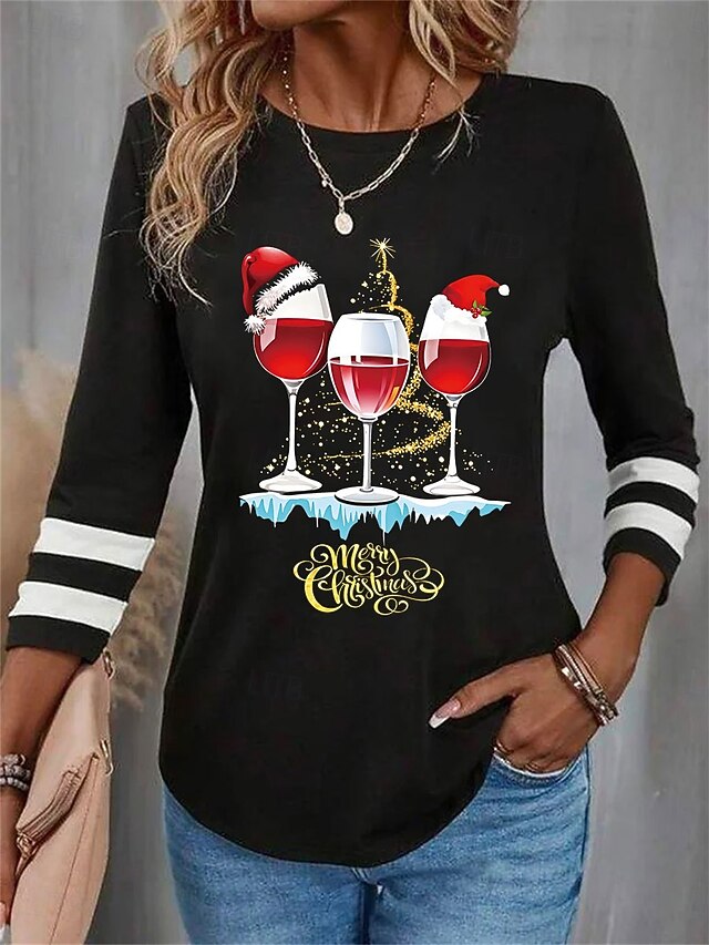 More information about Christmas Women's T Shirt Graphic Letter Wine Glass Vintage Fashion Stylish Long Sleeve Crew Neck Round Neck Regular Tops Daily Weekend Print Black Wine Blue Purple Green Fall Winter