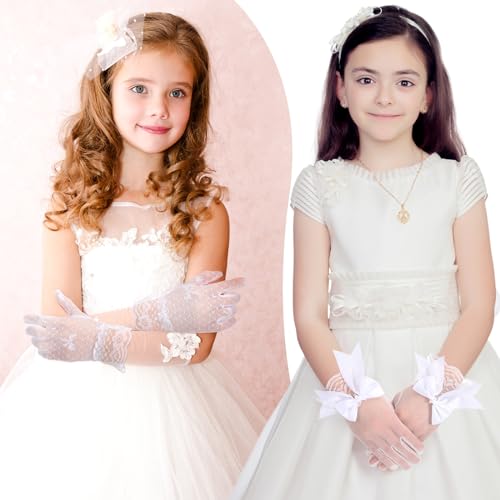 4 Pairs Tea Party Gloves for Little Girls Kids Lace Short White Satin Princess Dressing Gloves with Bows for Party 1