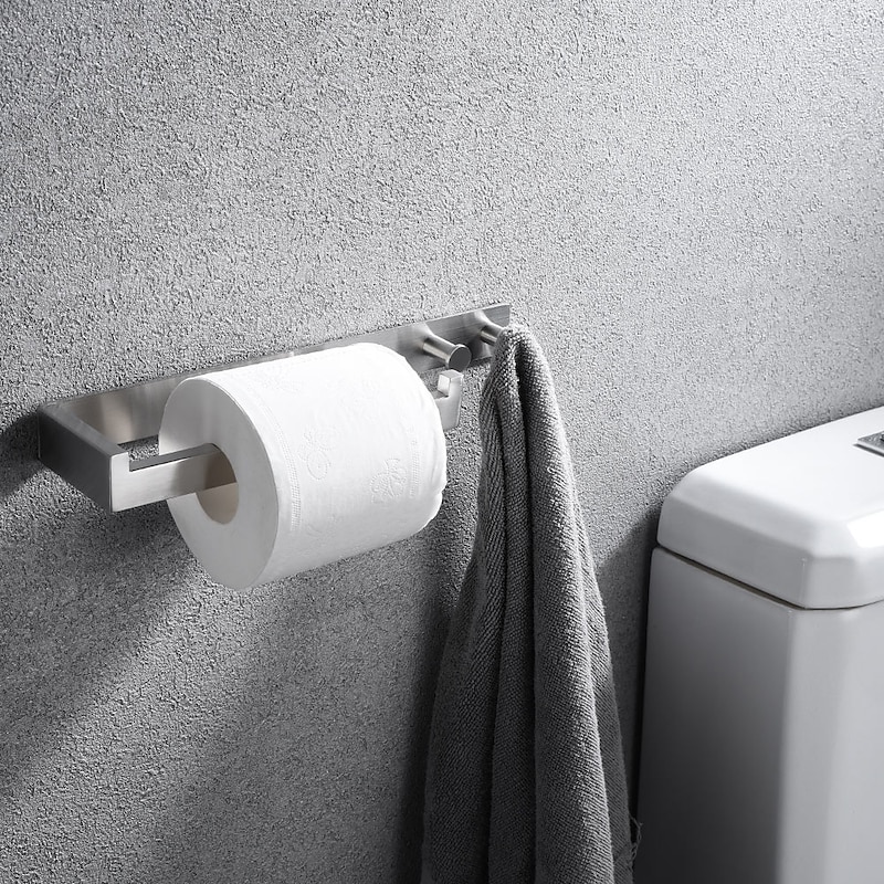 Multifunctional Towel Bar with Coat Hooks Punch-free Self-adhesive Bathroom Shelf Stainless Steel Brushed Silver and Black 1pc 1
