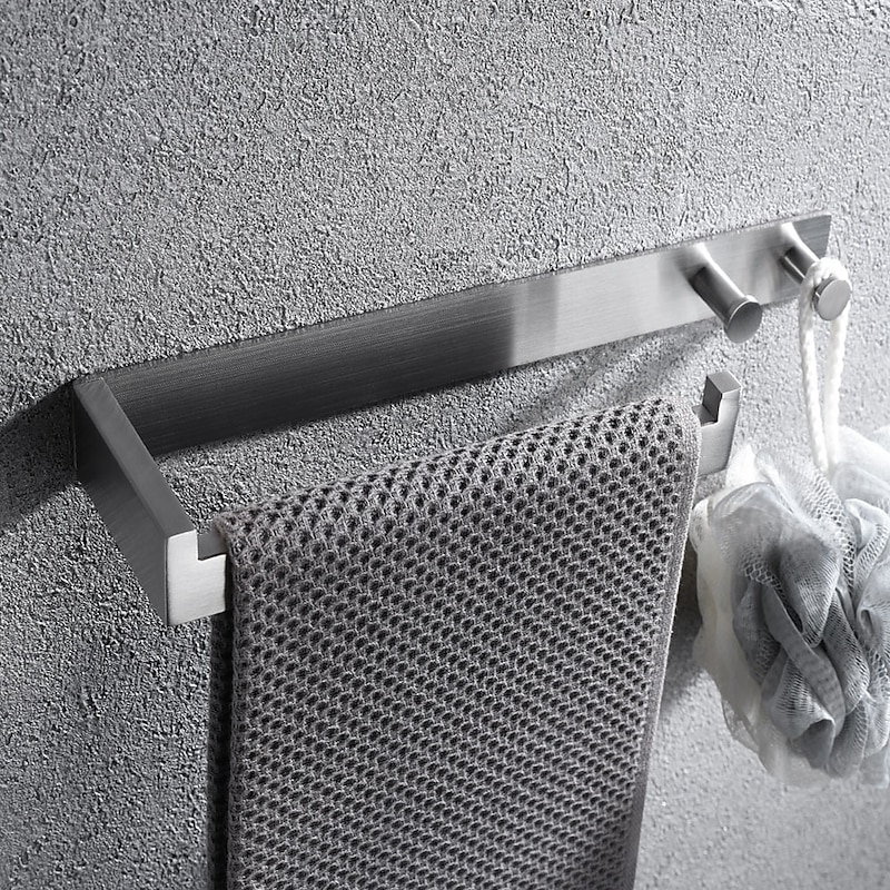 Multifunctional Towel Bar with Coat Hooks Punch-free Self-adhesive Bathroom Shelf Stainless Steel Brushed Silver and Black 1pc 9