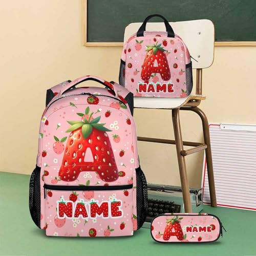 Girls Schoolbag, Custom Strawberry Letter Backpack for Girls, Personalized 3Pcs Set Casual Bookbag for Preschool Elementary Kindergarten Travel 3