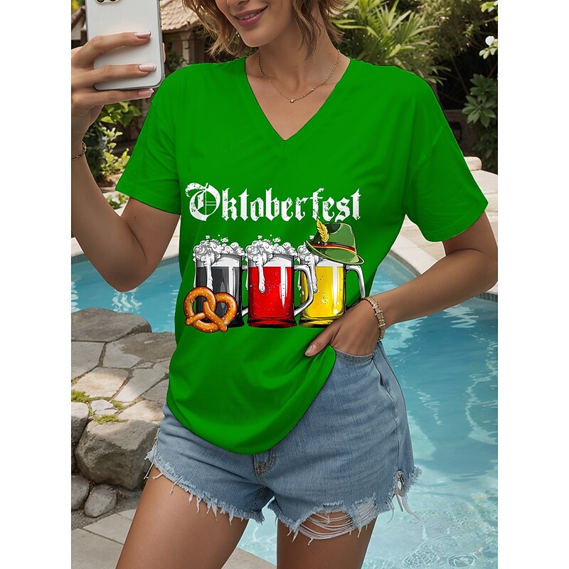 Oktoberfest Women's T Shirt Graphic Letter Vintage Stylish Classic Short Sleeve V Neck Regular Tops Daily Print Black White Yellow Red Blue Summer Spring 15