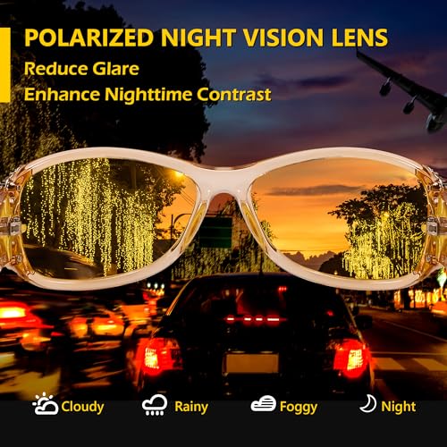 • [Night Vision Design] Polarized yellow lenses can effectively reduce glare from headlights and street lights, alleviate visual fatigue, improve contrast, and allow you to see clear things and drive safely at night.