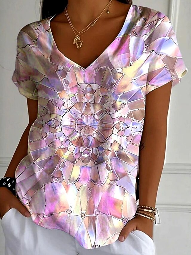 Women's T Shirt Graphic 3D Fashion Stylish Casual Short Sleeve V Neck Regular Tops Daily Going out Weekend Print Light Green Pink Blue Purple Summer Spring 5