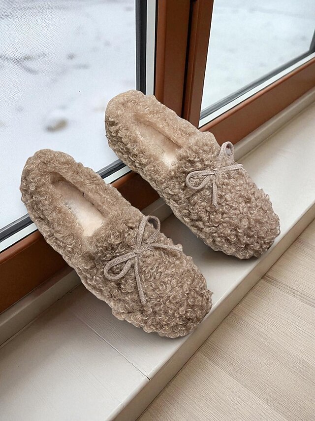 Women's Beige Fleece Loafers – Cozy Faux Shearling Slip-On Flats with Bow Detail, Warm Winter Indoor Outdoor Shoes for Home, Travel, and Casual Wear 11