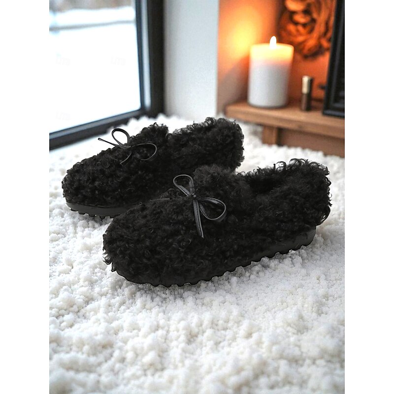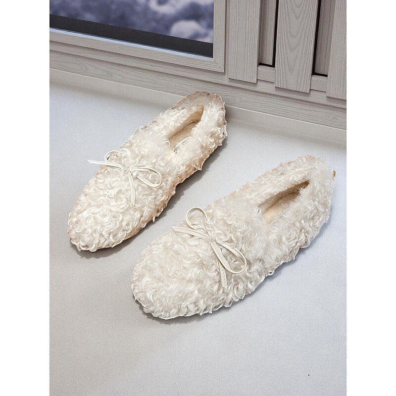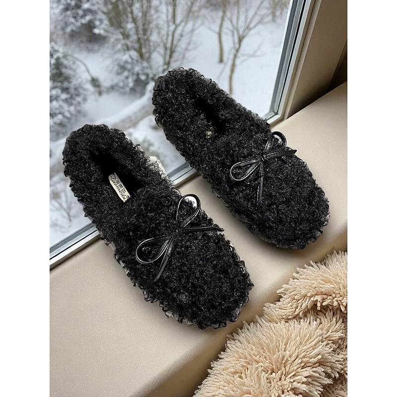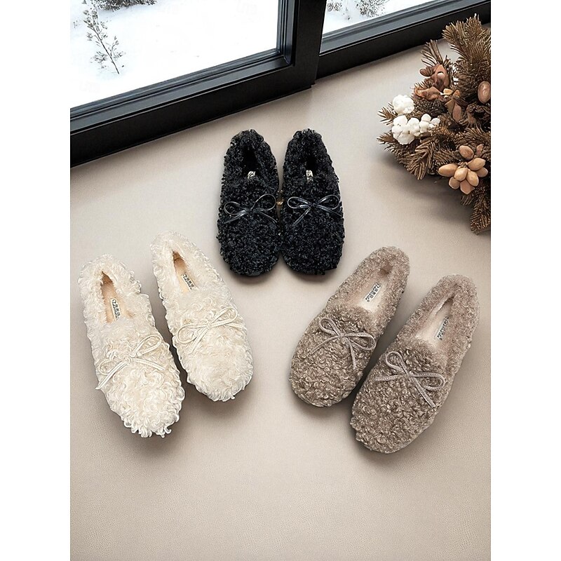 HOT ! Women's Beige Fleece Loafers – Cozy Faux Shearling Slip-On Flats with Bow Detail, Warm Winter Indoor Outdoor Shoes for Home, Travel, and Casual Wear