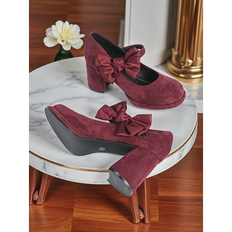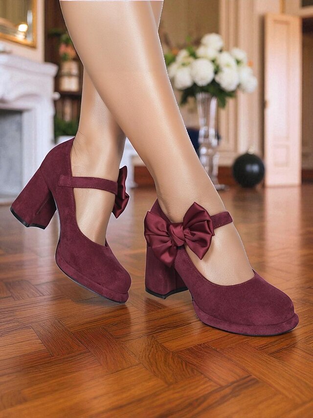 HOT ! Women's Burgundy Suede Mary Jane Heels with Bow Accent – 1950s Retro Block Heel Party Shoes for Christmas,Vintage Cocktail Party and Elegant Street Fashion