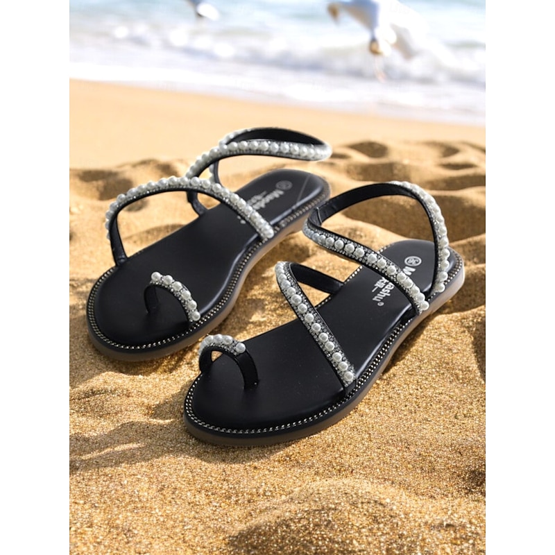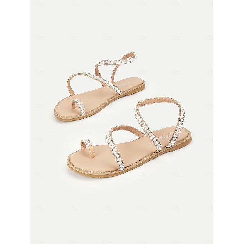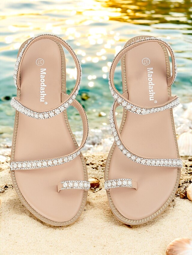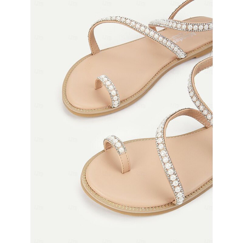 HOT ! Women's Pearl Strappy Flat Sandals – Elegant Rhinestone Beach Sandals for Summer, Weddings, and Casual Outings