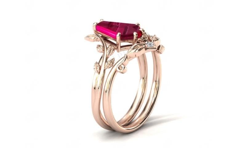 Vintage Red Ruby Engagement Ring Set Anniversary Ring Set For Women Coffin Shaped Art Deco Leaf Style Wedding Ring Set 7
