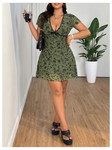 SHENHE Women's Plus Size Y2k Floral Mesh Mini Dress Deep V Short Sleeve Fit and Flare Sundress