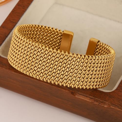 Material: Stainless SteelMetal type: Stainless SteelClasp type: SlideGem type: No gemstoneTrendy Gold Cuff Bracelet: Our gold cuff bracelet features a stylish weave braided design, and creating a charming vintage style with timeless charm that can be worn with any outfit. You will can make you stand out from the crowdAdjustable Chunky Wide Bracelets: Our gold woven cuff bracelets are designed to be easily adjustable in size, it's makes the vintage wide bracelet easy to open and adjust to your right sizeTop Material: The open woven bracelets are made of stainless steel, ensuring long-lasting durability and resistance to tarnish. The woven cuff design adds an extra level of durability, it is can be worn on its own or layered with other statement bracelets for a trendy and eclectic lookPefect Wide Bangle for Women Gifts: The stainless steel bangle are packed in a delicate gift case, which is a perfect choice among delicate jewelry. This stainless steel bangle bracelet can be gifted as a birthday, mother's day, Christmas, etc. for mother, wife an important gifts for good sisters and yourself. Express your sincerest love to themAfter-Sale Service: If you have any questions about our stainless steel bangle bracelets, please feel free to contact us. We will provide you with solutions within 24 hours. Rest assured shopping and good experience are always our top priority. Perfect for everyday use. excellent materials and excellent craftsmanship ensure long-lasting durability.