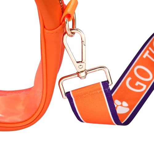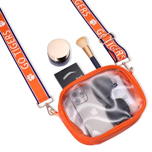 • ♥ Clear Stadium Bag -- It's game day. Our stadium-approved clear bags are the perfect accessory. Features a clear PVC body and a faux leather trim, matched a wide purse strap with bold letter ‘GO TIGERS’ and paw pattern repeated in orange white purple colors, it is perfect for carrying your everyday essentials and is approved for stadiums, festivals, concerts and sporting events. The clear crossbody purse bag offer your a fashionable fast-pass through the security lines