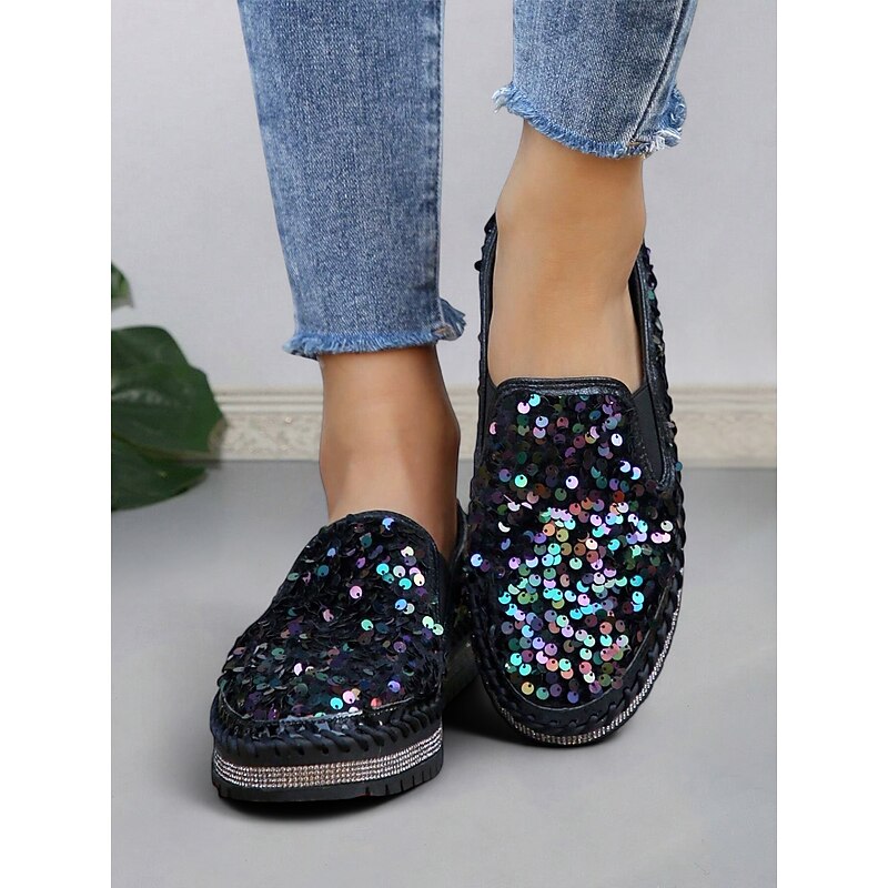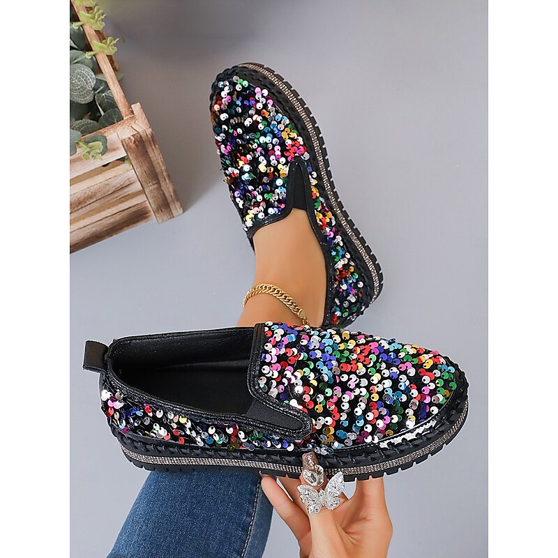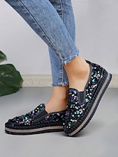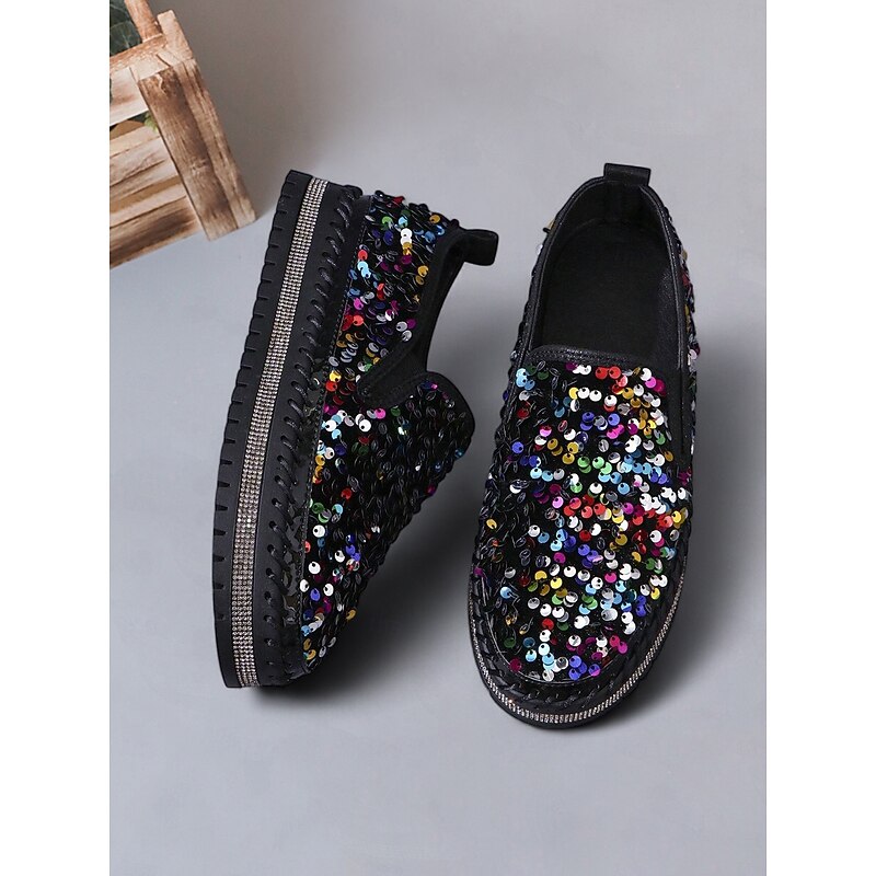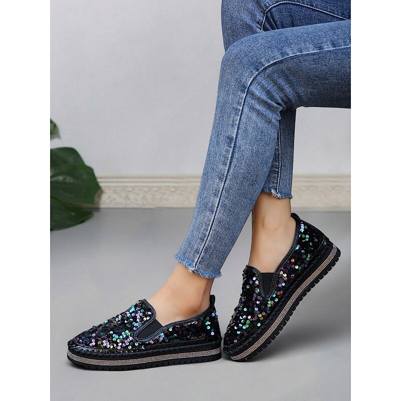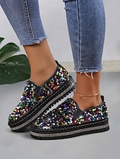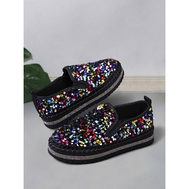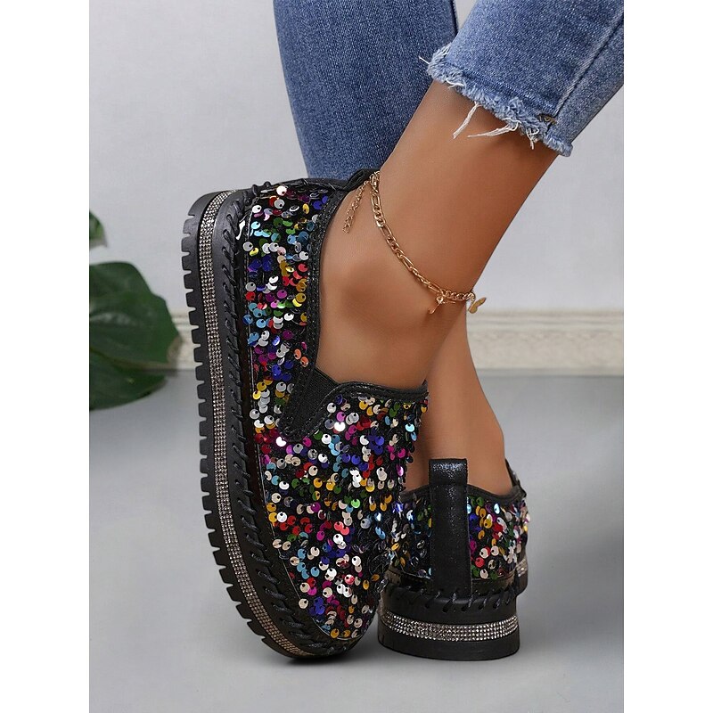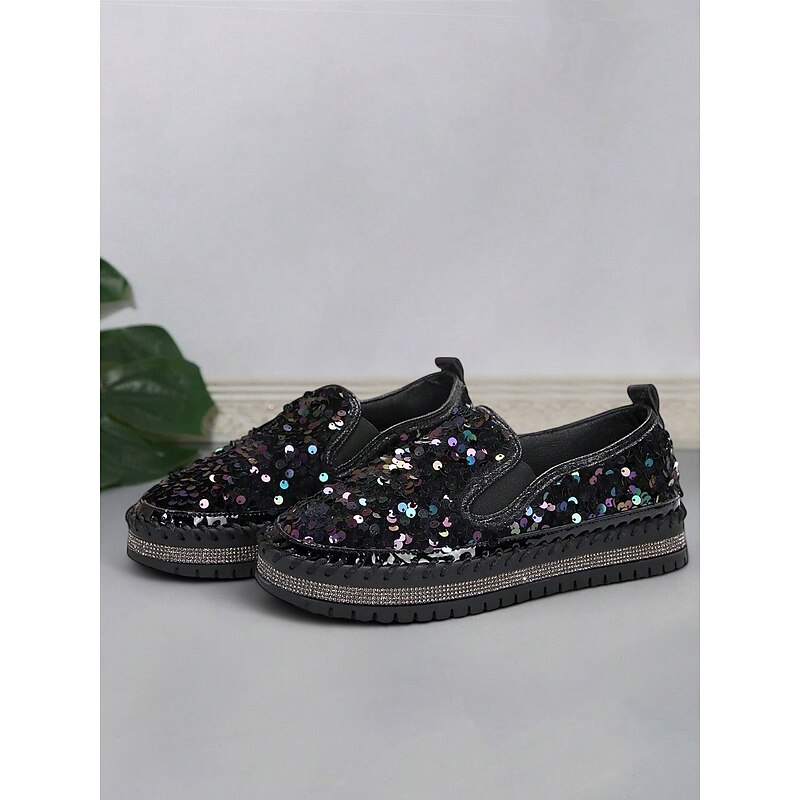 HOT ! Women's Black Sequin Slip-On Platform Shoes with Rhinestone Trim - Sparkly Casual Shoes for Parties and Everyday Wear