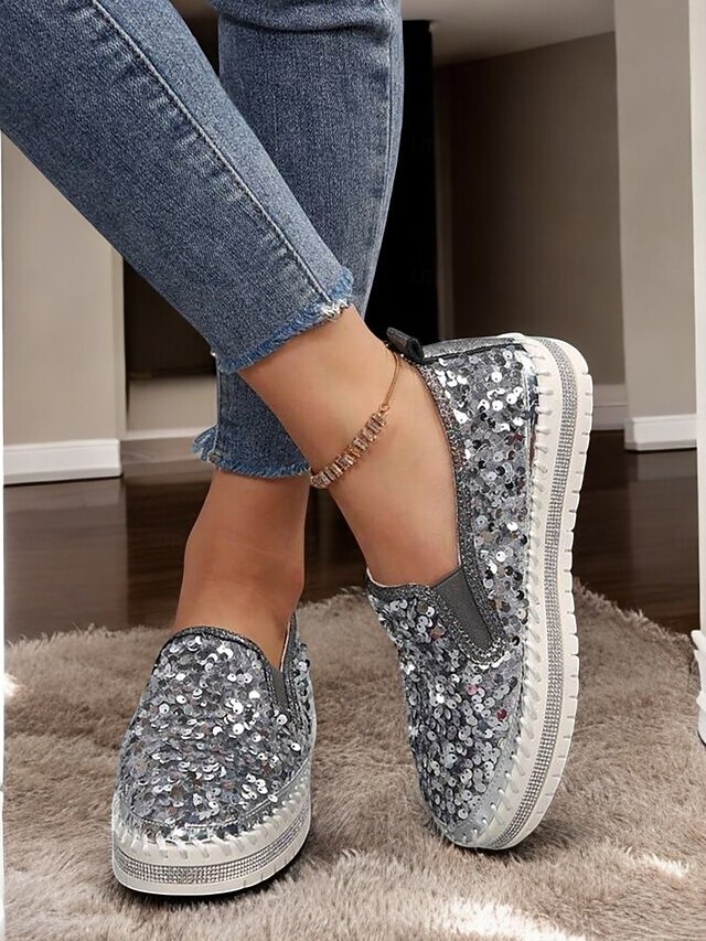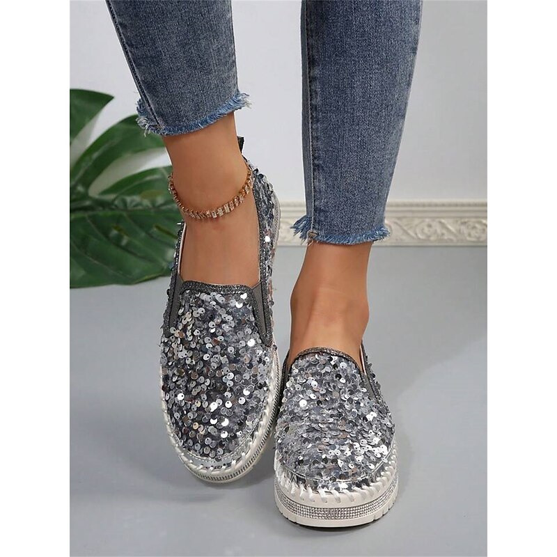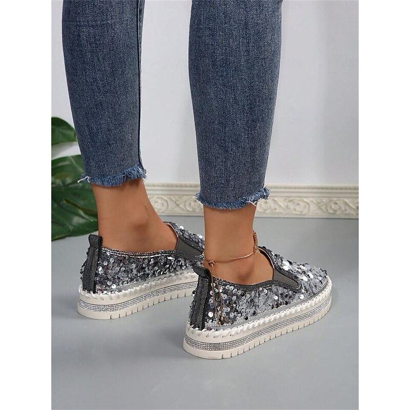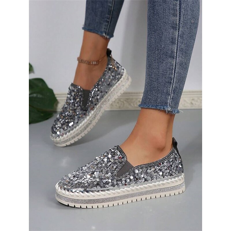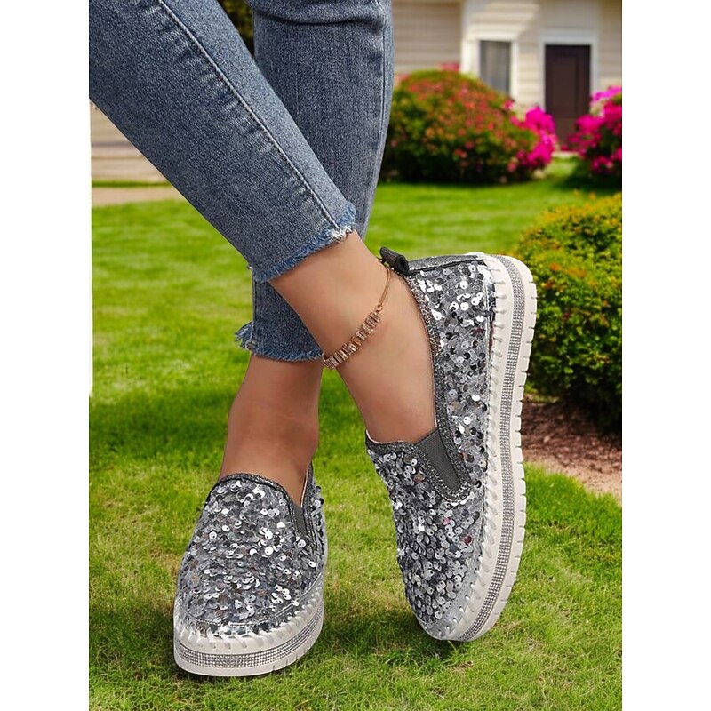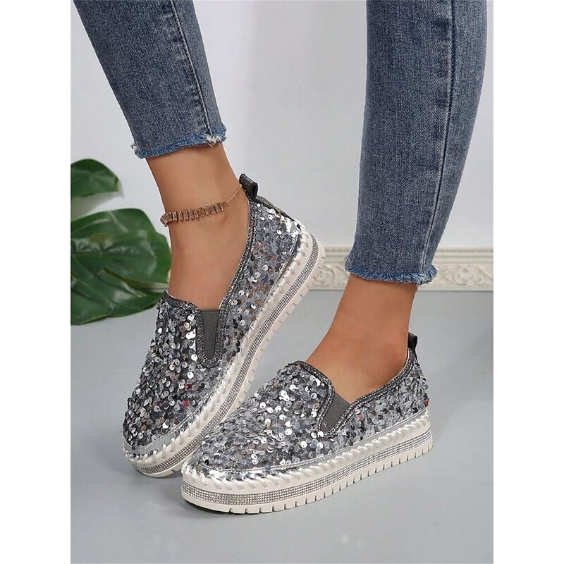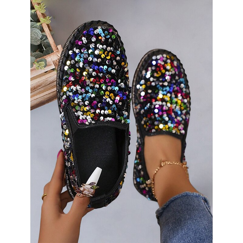 HOT ! Women's Black Sequin Slip-On Platform Shoes with Rhinestone Trim - Sparkly Casual Shoes for Parties and Everyday Wear