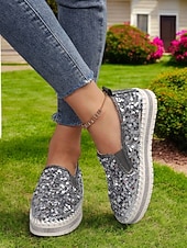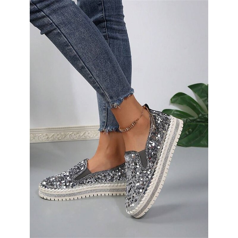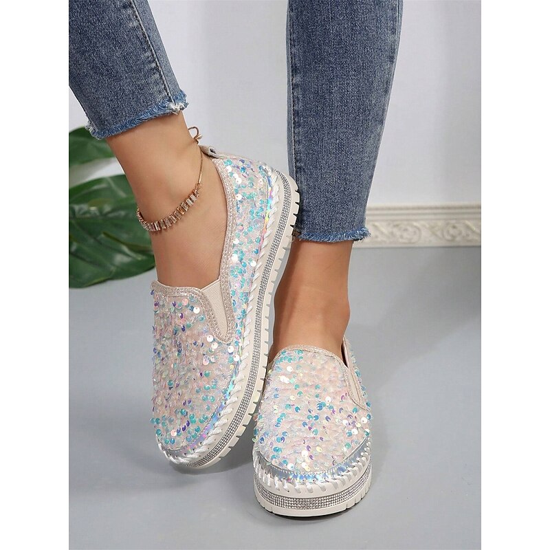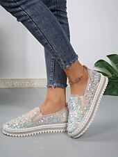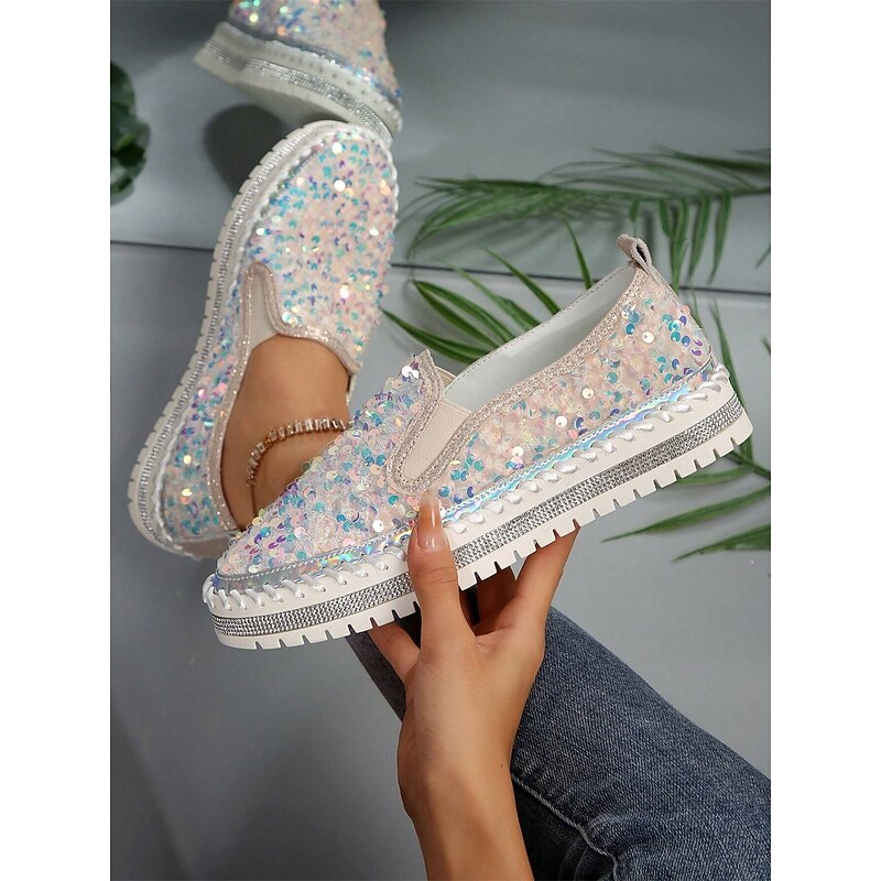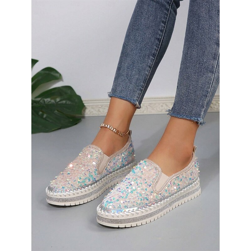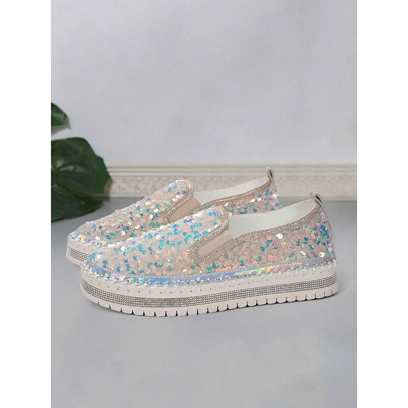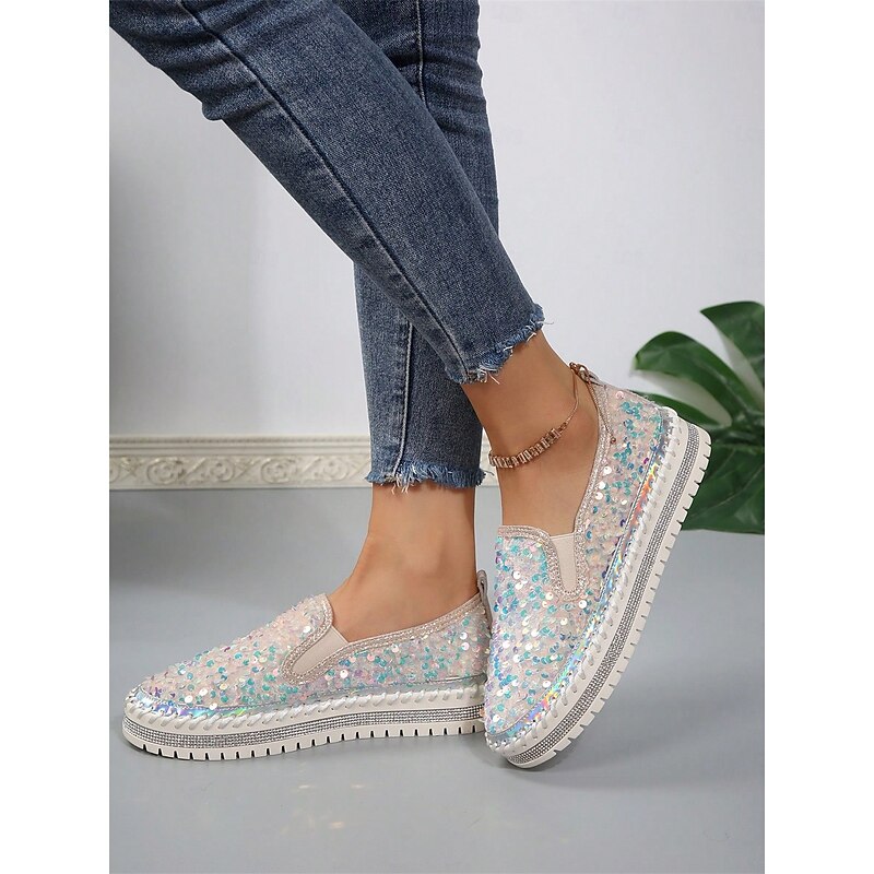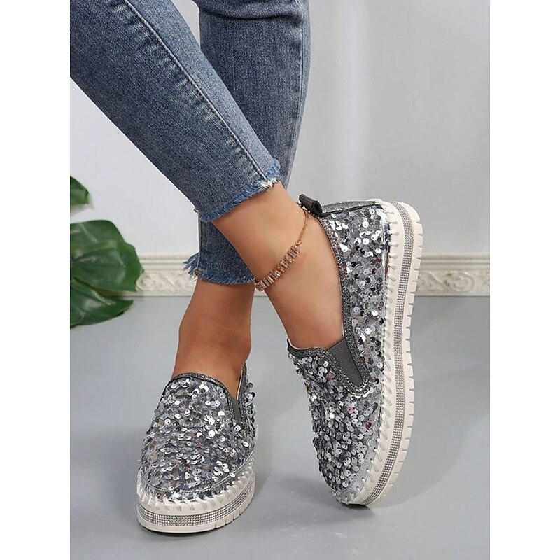 HOT ! Women's Black Sequin Slip-On Platform Shoes with Rhinestone Trim - Sparkly Casual Shoes for Parties and Everyday Wear