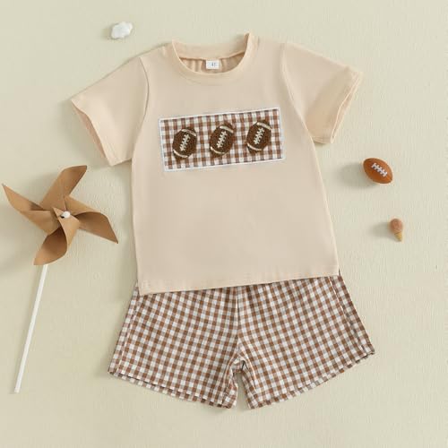 Toddler Baby Boy Football Outfit, Football Embroidery Short Sleeve T-shirt and Plaid Shorts 2Pcs Summer Clothes