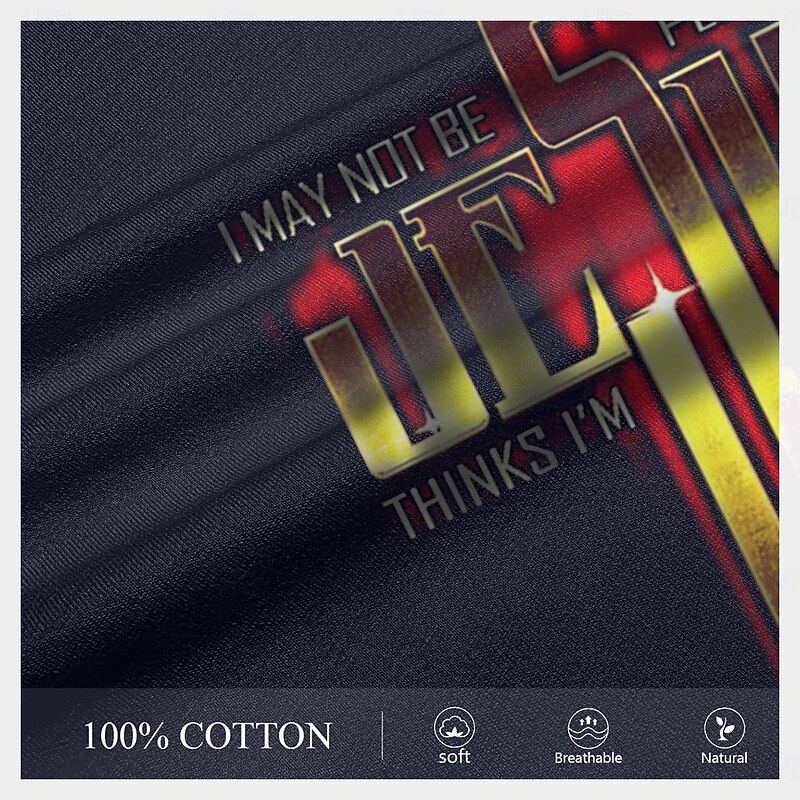 The T-shirt features a bold, colorful graphic print on the front, combining quotes and sayings with a striking cross and letter design. Accented with shades of red and gold, the print stands out beautifully against the black and dark blue backgrounds, making it an eye-catching statement piece.